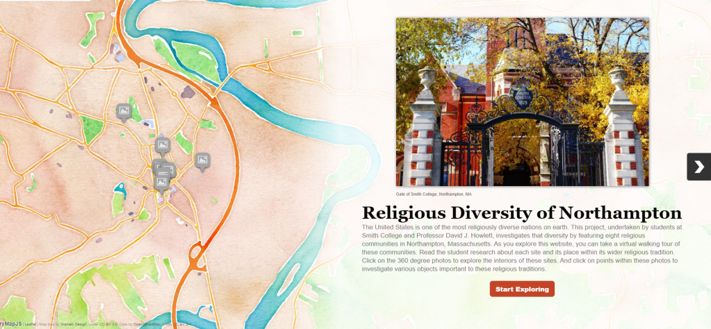 In “American Gods: Religious Diversity in the US,” students created a virtual walking tour of Northampton, Massachusetts religious communities, a project featured by our local public library in their online newsletter in April 2020. To construct our virtual tour, students researched each religious tradition, conducted an ethnographic site visit to an assigned community, and published their research on our website.